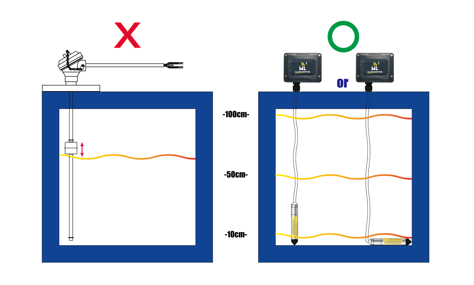 測定対象液タンクの一番深い底面に直接入れて横向きに寝かせて置くだけで、特別な設置は不要。上下する液面水位をリアルタイムにリモート監視測定できます。